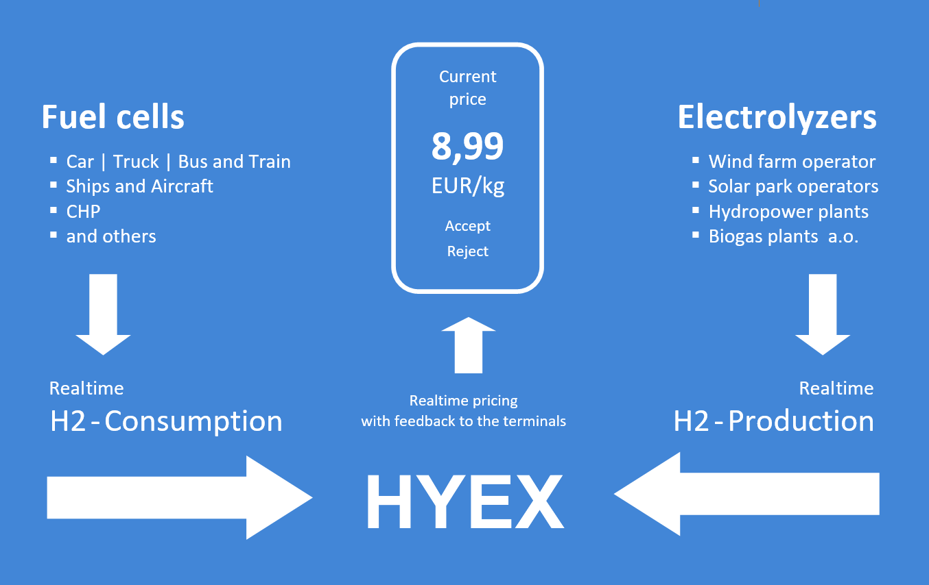 In real time, the end devices (fuel cells) report their current consumption and the producers (electrolysers) their current hydrogen production to HYEX. According to current production (supply) and current consumption (demand), HYEX determines a fair price, which is in turn transmitted to the end devices. In a time window, you can now decide whether you want to refuel at this price or whether you would rather wait for a new price proposal. On windy and sunny days, the price of hydrogen will fall; on days with little wind and sunshine, the price will rise. A rising price will encourage some consumers to postpone refuelling, so that demand falls again. In this way, the price regulates a shortage or oversupply of hydrogen to a reasonable level.